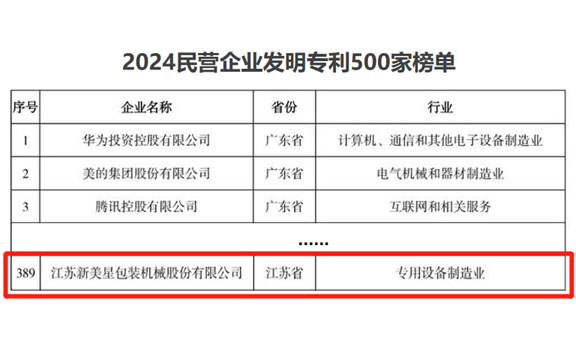 近日,2024年全國民營企業(yè)科技創(chuàng)新與標(biāo)準(zhǔn)創(chuàng)新大會在哈爾濱召開。會上,發(fā)布了2024研發(fā)投入前1000家民營企業(yè)創(chuàng)新狀況報告,以及一系列相關(guān)榮譽榜單、名單。新美星以卓有成效的發(fā)明專利成果順利入圍“2024民營企業(yè)發(fā)明專利500家”榜單。