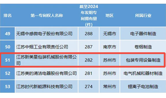近日,“2024年江蘇制造業(yè)企業(yè)發(fā)明專利百強(qiáng)榜”正式揭曉,新美星憑借卓越的創(chuàng)新實(shí)力與深厚的技術(shù)積累榮耀登榜。值得關(guān)注的是,這已是新美星連續(xù)三年獲此殊榮,并且是包裝專用設(shè)備制造領(lǐng)域唯一上榜企業(yè),彰顯了新美星在行業(yè)內(nèi)的創(chuàng)新引領(lǐng)地位。